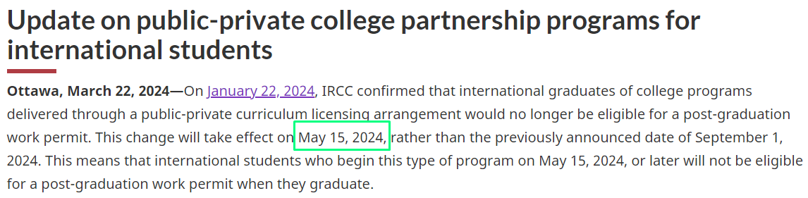 2024年3月22日,加拿大移民局再度更新私立公立合作项目的毕业工签政策。