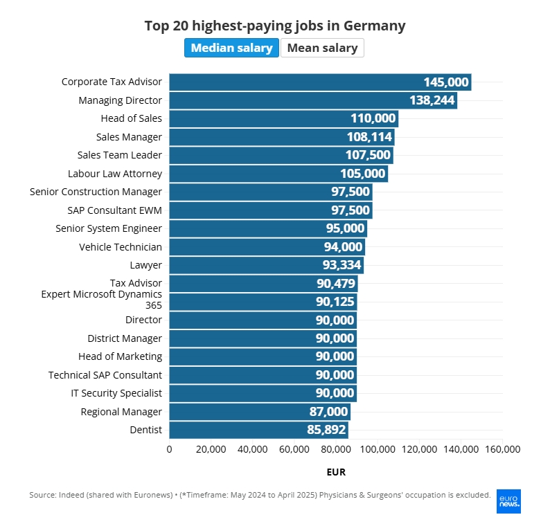 在德国,企业税务顾问的年薪中位数最高,为14.5万欧元。图表还显示了平均薪资,以供比较。