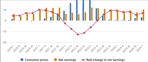 平均净工资和薪金(根据雇主适用的劳动税计算)为1,305欧元(占总收入的74.3%),同比增长10.6%,超过了消费者价格指数和总收入的涨幅。考虑到物价上涨,净收入的实际增幅为7.0%。