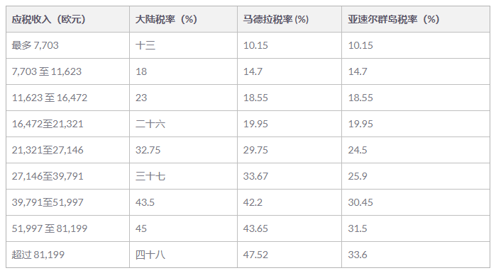 葡萄牙采用累进所得税制,税率因地区(大陆、马德拉群岛和亚速尔群岛)而异。税率等级和税率如下:
