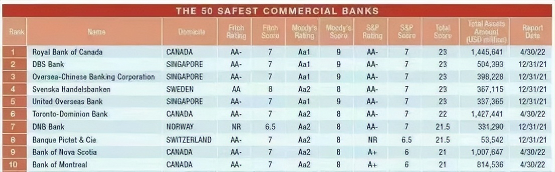 据美国金融杂志《环球金融》(Global Finance)公布2022年度全球最安全的50家商业银行榜单显示,新加坡在前五名中占据了主导位置,星展银行排第二,华侨银行排第三,大华银行排第五。
