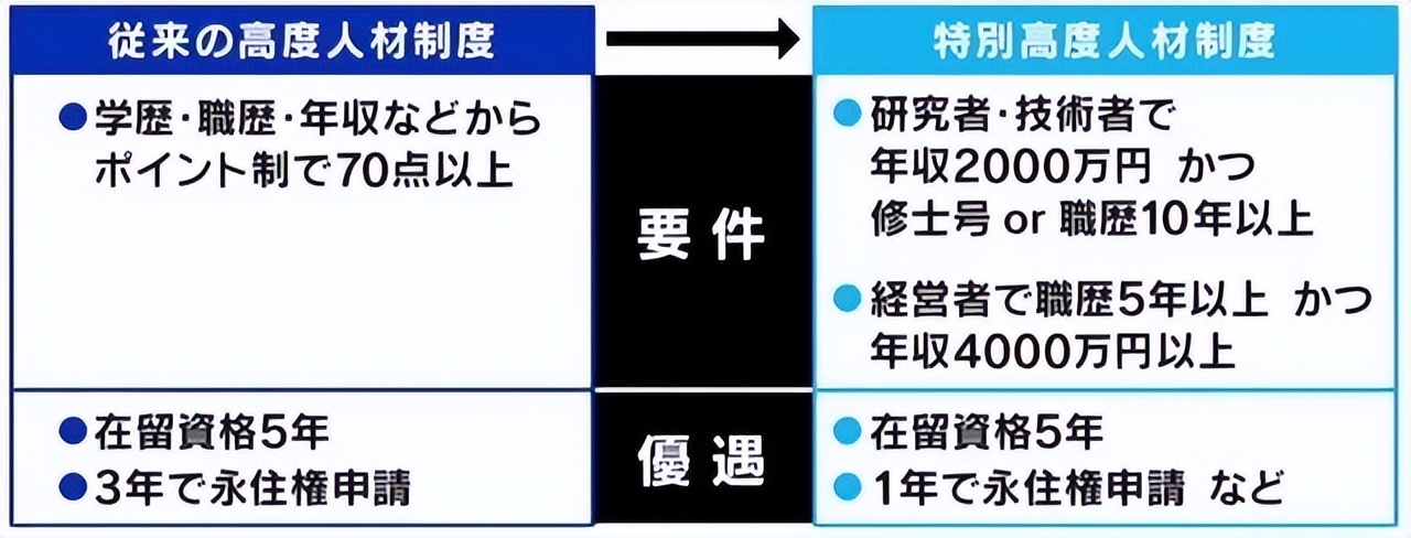 具体为:只要外国人才拥有硕士学位及以上,年收入达到2000万日元(约合人民币103万元),将授予“高技能人才1号在留资格”,只需在日本居住一年,就可以获得日本永住资格。